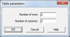 The Table parameters dialog box presented below allows you to determine the number of rows and columns that will constitute the table to be defined. The dialog box is opened by: