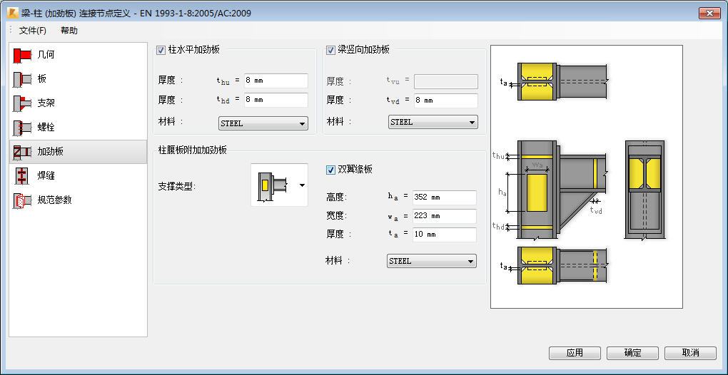 使用“加劲板”选项卡可定义梁的竖向加劲板和柱的水平加劲板。