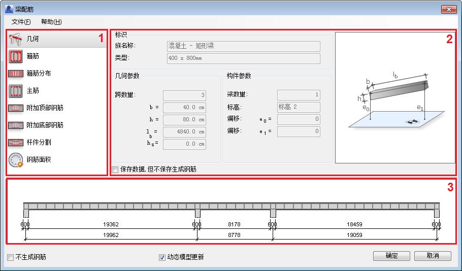 用于生成梁配筋的对话框包含 3 个主要部分: