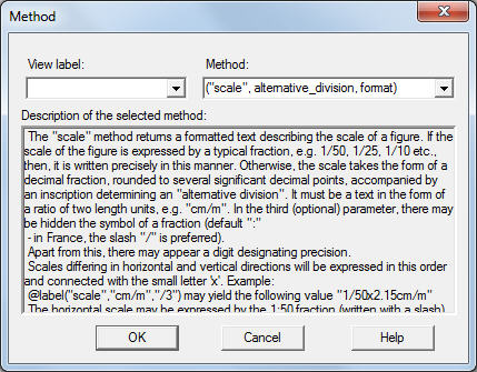 The Method dialog box takes the form presented on the drawing below. It contains a list of available methods accompanied by relevant descriptions. Additionally, you must specify the label of the view which the method will be applied to.