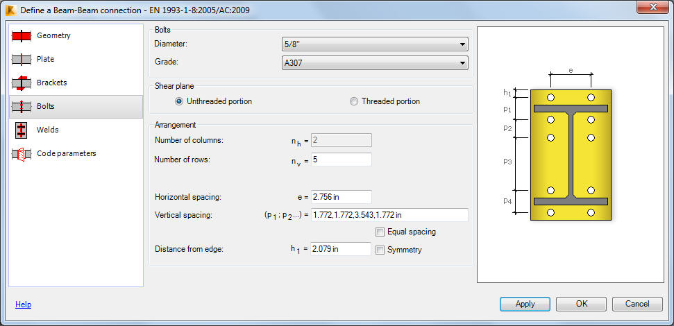 使用“螺栓”选项卡可定义连接中使用的螺栓的直径和等级,并相对于端板边缘排列螺栓。