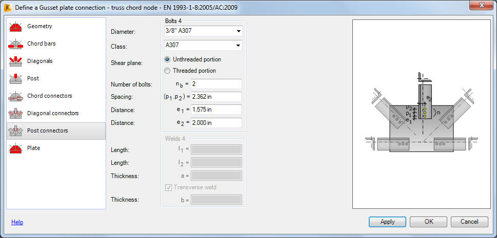 用于连接钢筋和节点板的螺栓的直径和类别,以及螺栓在钢筋和剪力平面上的排列情况(如果为此钢筋选择了螺栓连接)