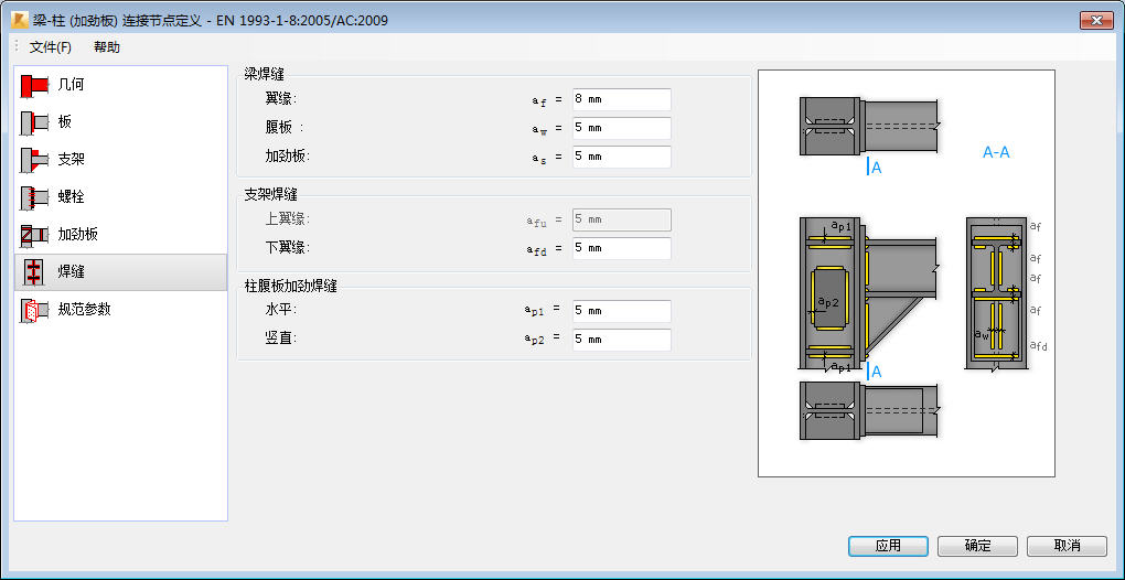 使用“焊缝”选项卡可定义连接梁与端板的焊缝厚度,以及连接加劲板与加劲柱腹板的板的焊缝厚度。