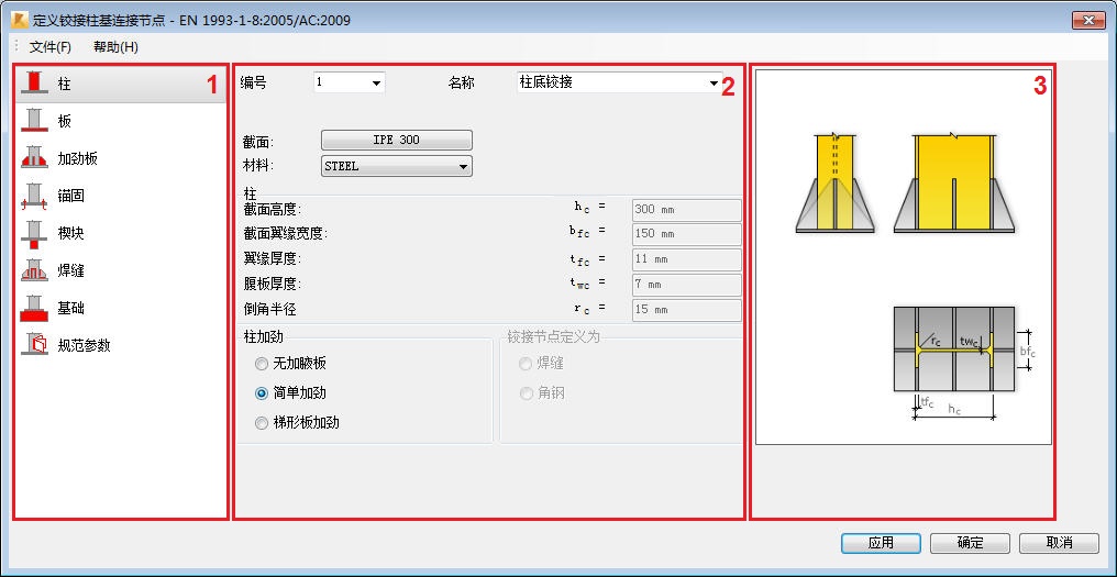 该对话框用于生成柱-基础连接节点(铰接或固接柱基),它有 3 个主要部分: