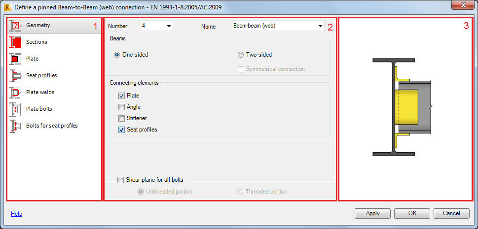 该对话框用于生成主梁-梁(腹板)或主梁-梁(翼缘)连接节点,它有 3 个主要部分: