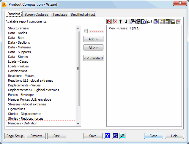 The dialog is divided into Left and Right panels. The left panel presents objects selected for printing (depending on the chosen tab). The right panel composes a complete printout that may contain all the objects specified in the left panel. To prepare the printout composition move objects from the left to right panels using the All and Add buttons. All moves all of the available objects to the right. Add moves only selected (highlighted) objects. Click the Standard button to make the current configuration composition a standard printout. All the printout components contained in the right panel will be transferred to the left panel of the Standard tab.