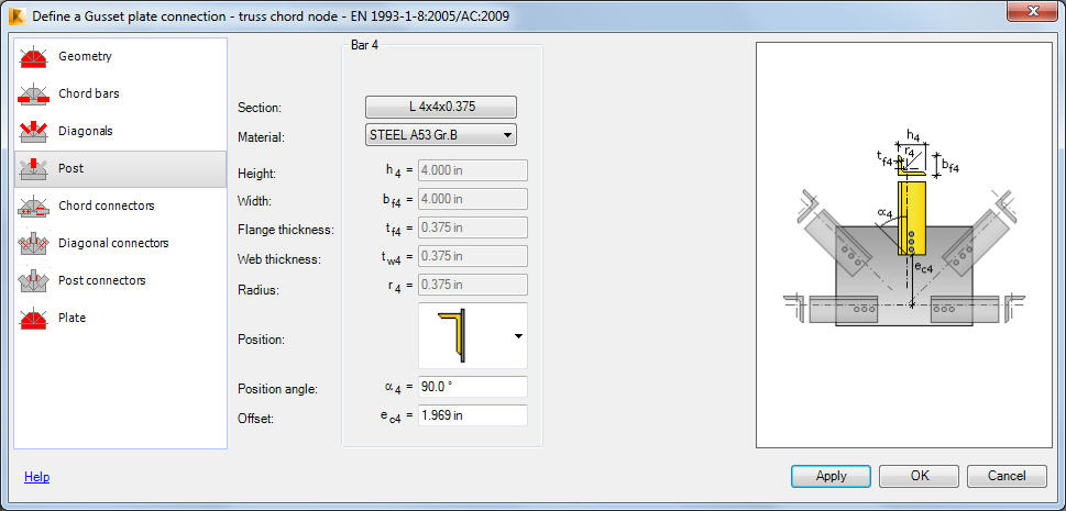 使用“立柱”选项卡可定义与节点板毗连的立柱的基本参数。这些参数包括: