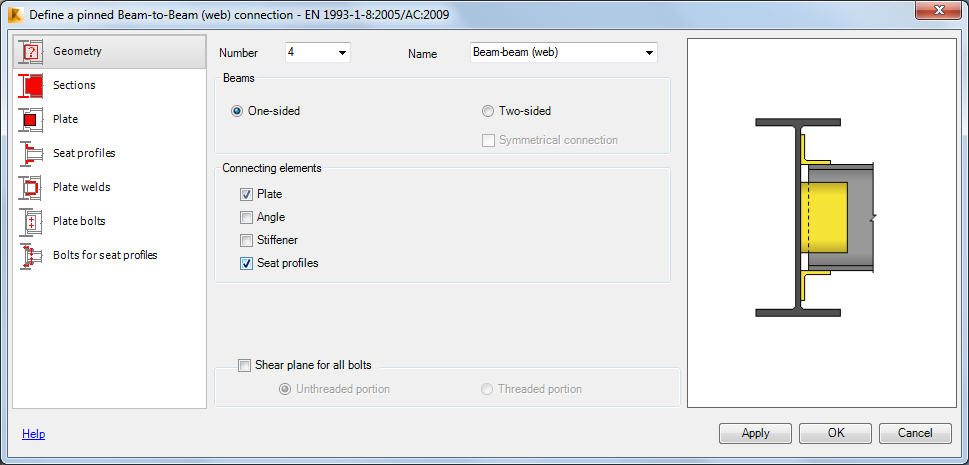 该对话框中的选项卡数目取决于选定的连接构件类型、其他加劲构件以及连接类型:焊缝或螺栓。