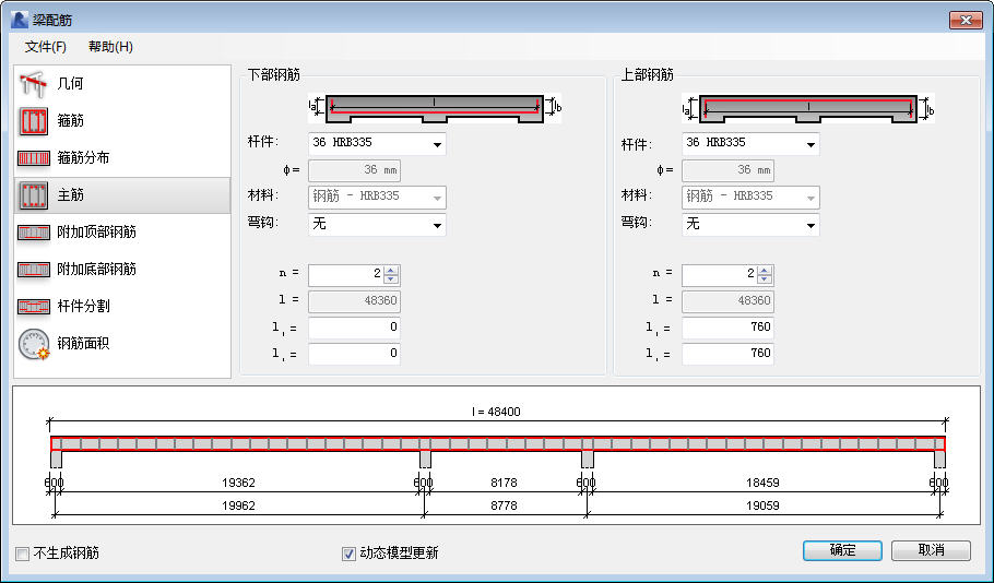 纵向钢筋是沿梁的整个长度生成。纵向钢筋的参数包括: