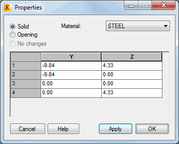 Use the contour to define the section surface or an opening located in the defined section (it is possible to define a concrete section in which a standard steel or aluminum section is contained). Define the properties of the selected contour in the Properties dialog. The coordinates of the characteristic points of the contour are presented in a table at the bottom of the dialog.