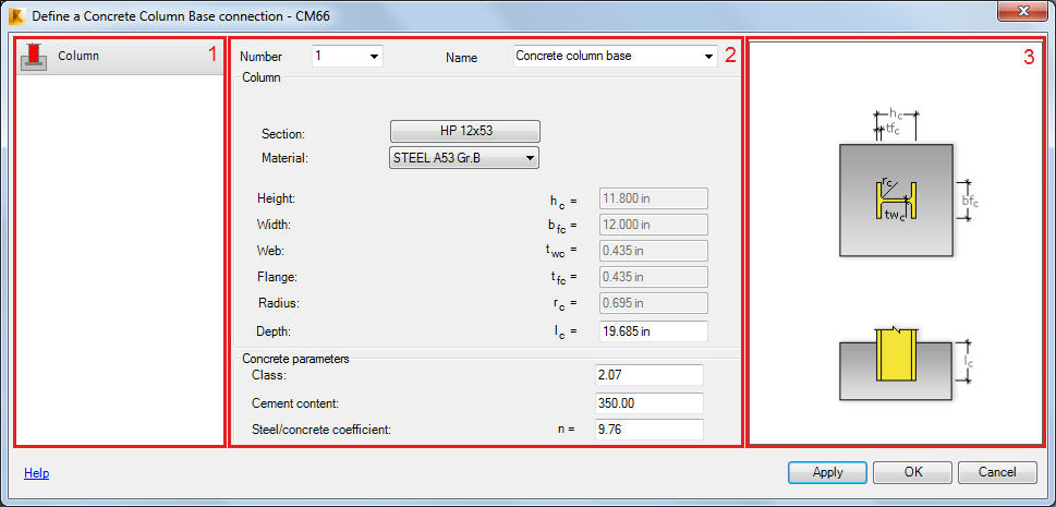 该对话框用于生成柱-基础连接节点(混凝土柱基),它有 3 个主要部分: