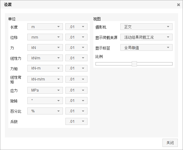 打开设置图标以打开“设置”对话框,用户可以在其中指定在视图中显示的结果的单位设置,以及模型和结果的其他显示设置。