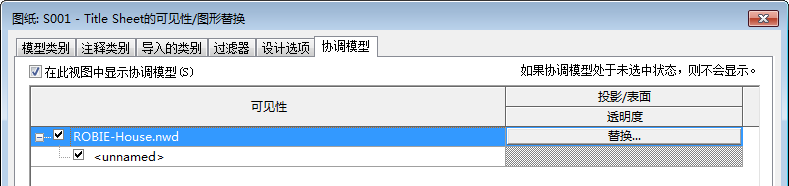 “可见性/图形”对话框中的“协调模型”选项卡包含以下设置: