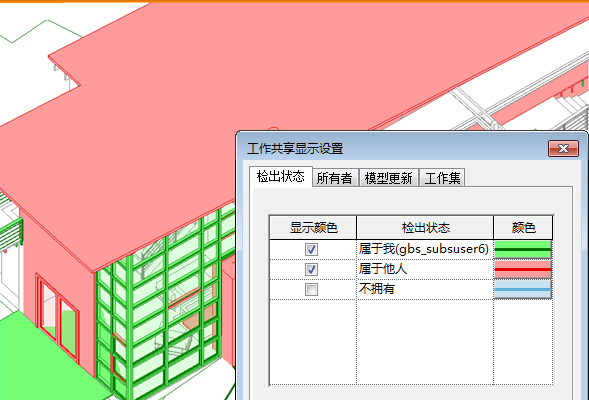 可以从视觉上区分工作共享图元检出状态。向属于任何团队成员的图元应用颜色。