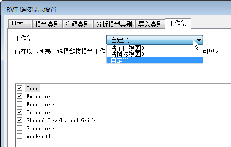 请使用主体模型“RVT 链接显示设置”对话框的“工作集”选项卡。在该选项卡上,可以选择要显示在主体模型某个视图中的特定工作集。