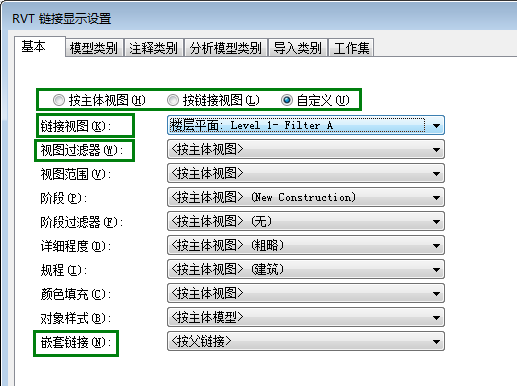 要控制主体视图中针对链接模型的过滤器的使用,请使用“RVT 链接显示设置”对话框中的设置。
