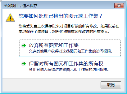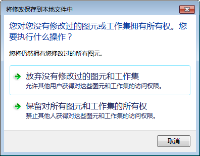 - 单击“保留对所有图元和工作集的所有权”,以保留对借用的图元和拥有的工作集的所有权。您将丢失已执行的修改。