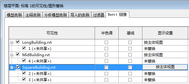 “可见性/图形”对话框中的“Revit 链接”选项卡包含以下各列: