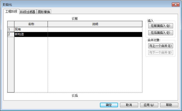 “阶段化”对话框将打开,其中显示“工程阶段”选项卡。 默认情况下,每个工程都有称为“现有构造”和“新构造”的阶段。