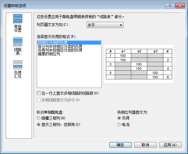 按相位分类的负荷:此格式只能用于双列分支配电盘样板,每条线路都将显示在其各自的行中。