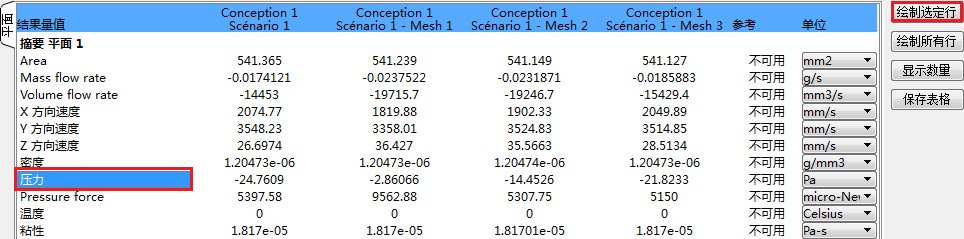 要打印四个网格中的压力,请单击“压力”,然后单击“绘制选定行”按钮: