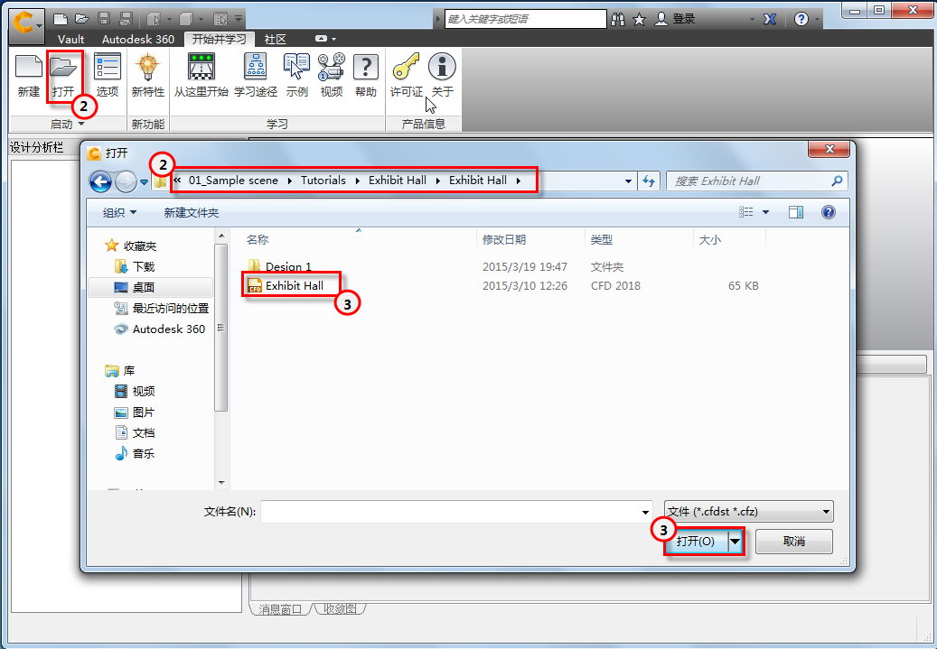 2. 在“启动”面板中,单击“打开”,然后导航到 C:\Users\Public\Public Documents\Autodesk\CFD 2018\Tutorials\Exhibit Hall。