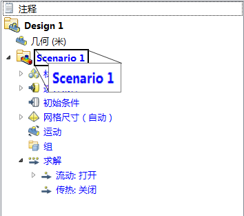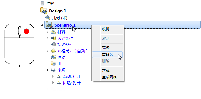 5. 在设计分析栏中的“工况 1”上单击鼠标右键,然后单击“重命名”。