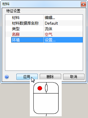 4. 在“材料”快速编辑对话框中,确认“类型”为“流体”,并且“名称”为“空气”。