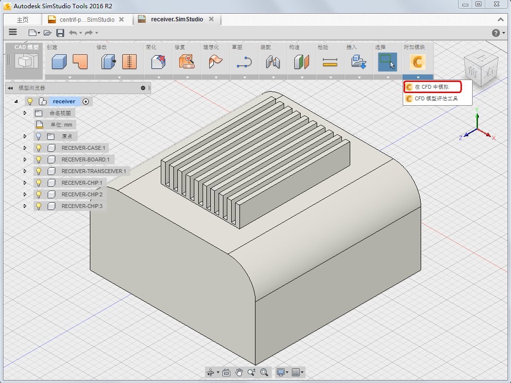 展开“插件”菜单,然后选择“在 CFD 中模拟”。