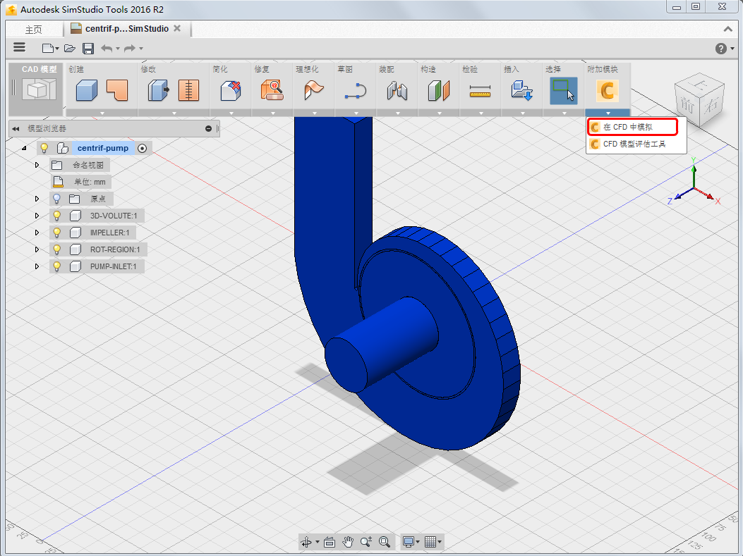 展开“插件”菜单,然后选择“在 CFD 中模拟”。