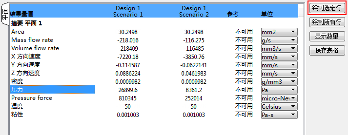若要打印压力,请单击“压力”,然后单击“绘制选定行”。