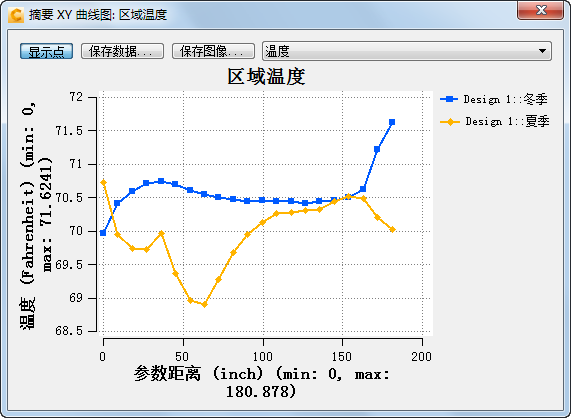 注: 正如预期,较高的温度曲线来自冬季工况,较低的温度曲线来自夏季工况。在夏季曲线的中间,我们可以看到温度骤然上升(大约在 40 英寸内上升 2 华氏度)。这可能是由参观人员的体温引起的。