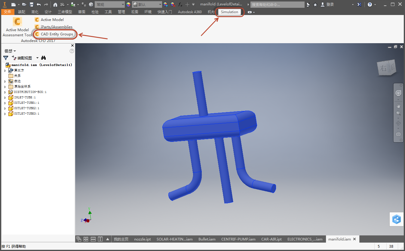 例如,如果您从 Autodesk® Inventor 中启动,单击“模拟”和“CAD 实体组”: