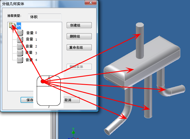 单击空气组,并从模型中选择这五个部件。