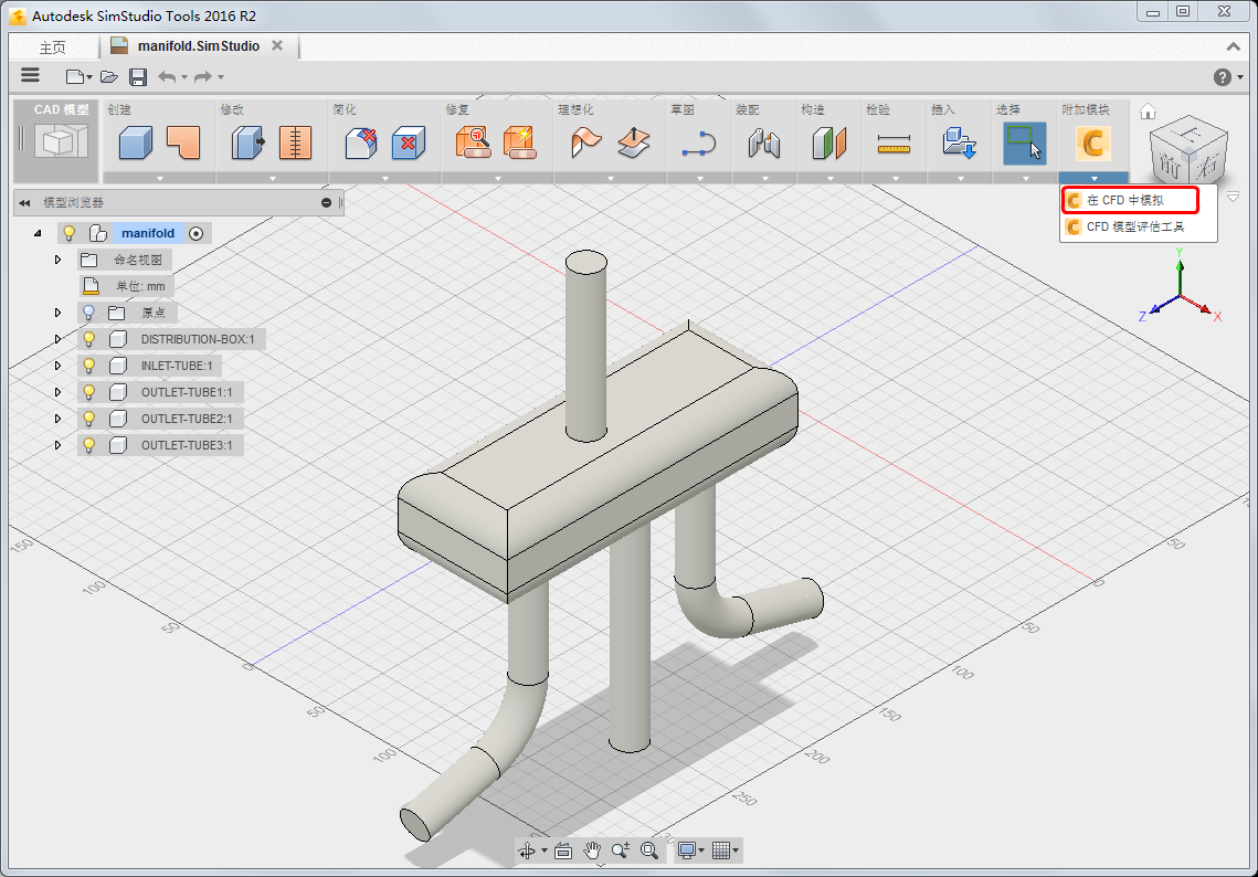 展开“插件”菜单,然后选择“在 CFD 中模拟”。