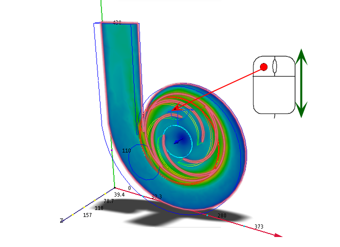 切平面会显示模型各处截面上的速度结果。使用切平面可以全面了解流动。使用矢量则可查看设备中各个位置的速度方向和速度大小。