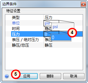 4. 将“单位”保留为“Psi”,并将“压力”值设置为 0。