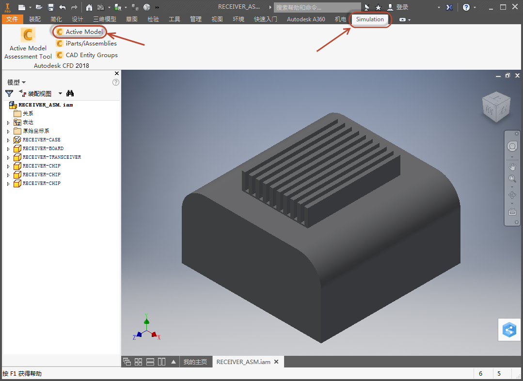 例如,如果您要从 Autodesk® Inventor 中启动,请单击“模拟”和“活动模型”:
