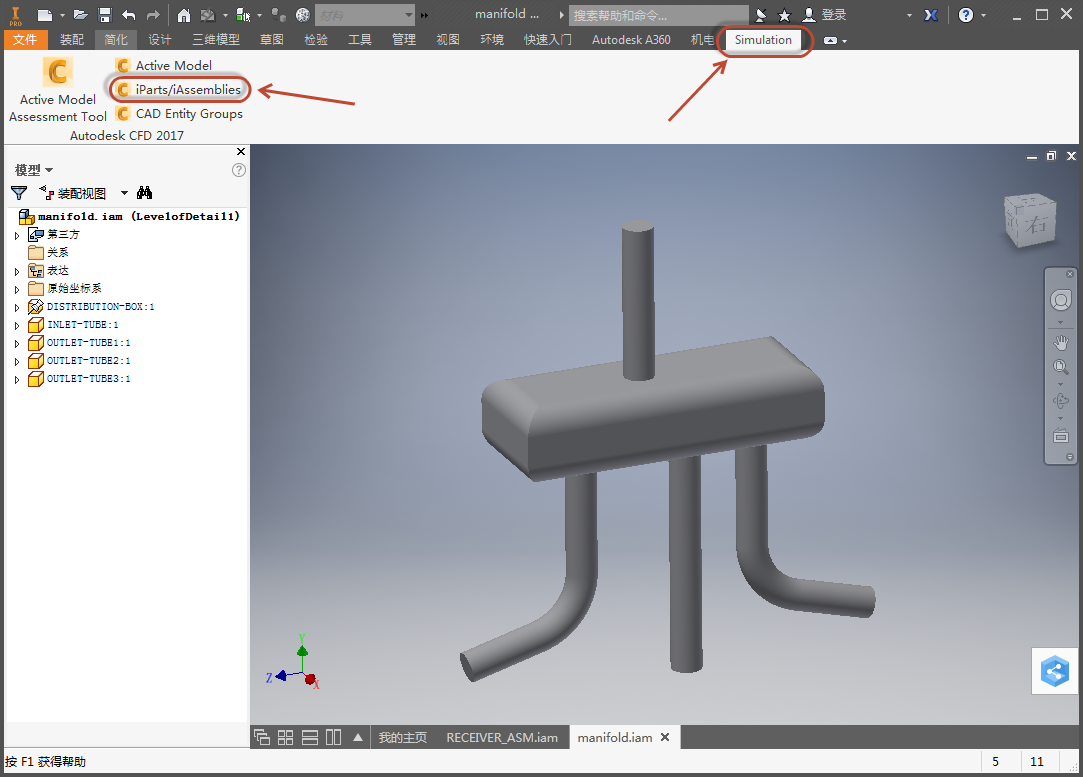 在 Autodesk® Inventor 中,单击 “模拟”和“iParts/iAssemblies”:
