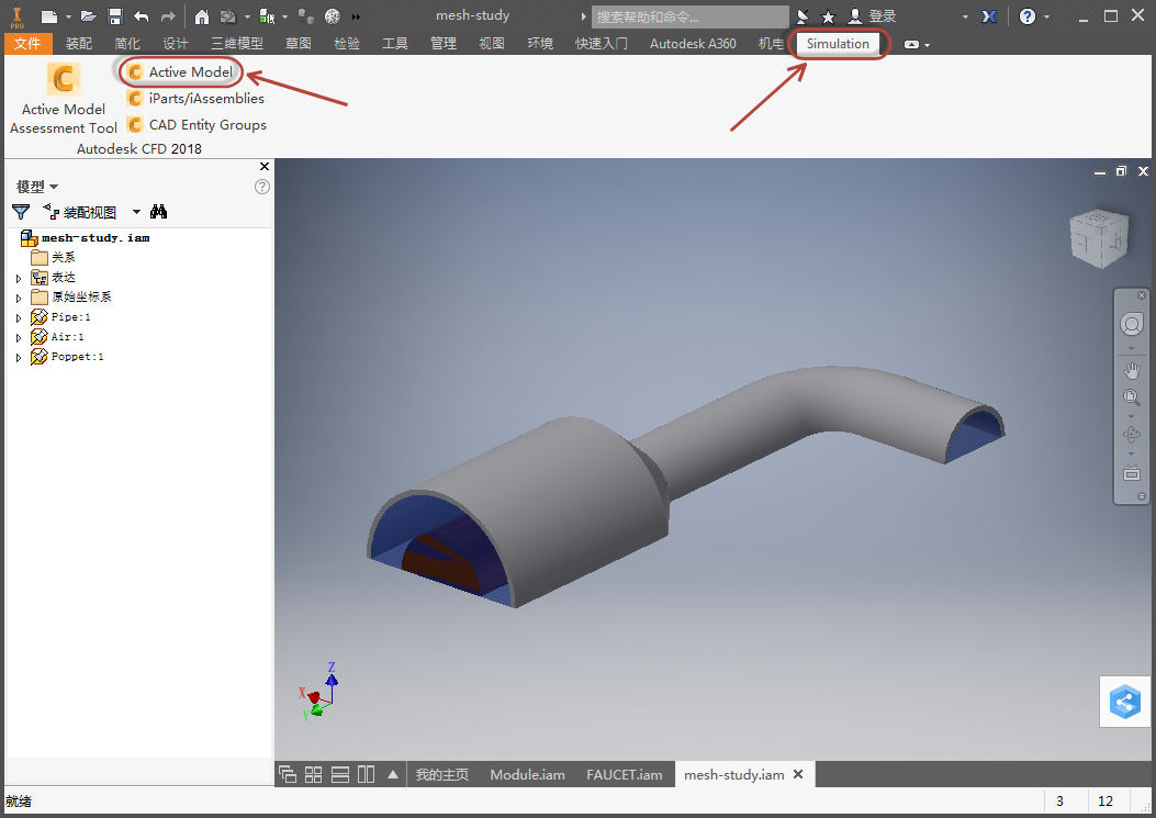 例如,如果您要从 Autodesk® Inventor 中启动,请单击“模拟”和“活动模型”: