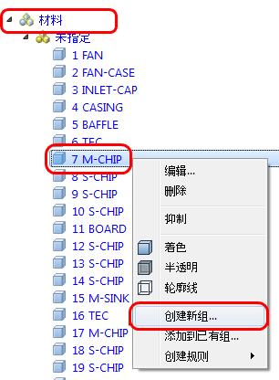 在“设计分析”工具栏上,展开材料分支。在其中一个名为“中型芯片”的部件上单击鼠标右键,然后选择“创建新组”。
