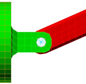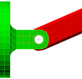 “连接”。此时将显示“连接网格设置”对话框。三个选定表面(活塞中两个孔,连接杆中一个孔)在“参与表面”标题下列出。连接类型显示为默认的“销 (轴线端点直线连接)”。部件号已自动设置为 4,这是下一个可用的未使用部件号。