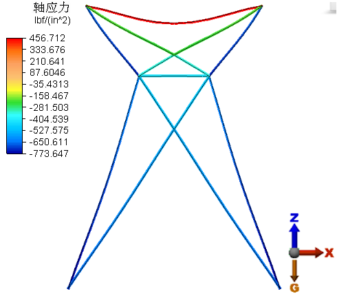 “轴向应力”。最大拉伸值约为 457 psi。最大压缩值约为 -774 psi。