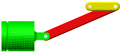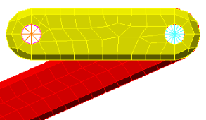 在创建前两个铰链之后,“铰链网格设置”对话框应当仍处于打开状态。部件号已再次递增到下一个可用的未使用部件号 (5)。而且,“参与表面”列表将被清除。这一次的铰链部件号必须不同于前两个铰链的部件号。为了将转动位移传输到曲柄,这一次的铰链必须具有梁单元。默认情况下为铰链指定的桁架仅传输轴向载荷。