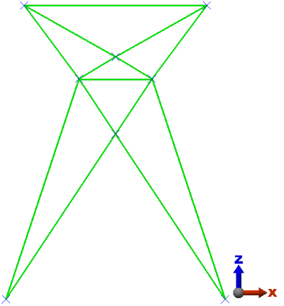 注: 实际局部轴 2 将始终垂直于每个梁单元分段。大多数 7x4 角度都倾斜。因此,轴方向相对于此组梁单元的全局轴变化。而弱弯曲轴始终与先前绘制的 8x6 角度的 Y 轴平行,而无论它们是否倾斜。两个梁单元端点和方向点定义局部轴 2 的平面。唯一的限制是方向点无法与任何梁分段共线。有关梁方向的其他信息,请参考