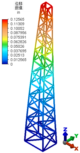模型显示第一个频率的相内结果。最大位移大小约为 0.126 英寸,如下所示。