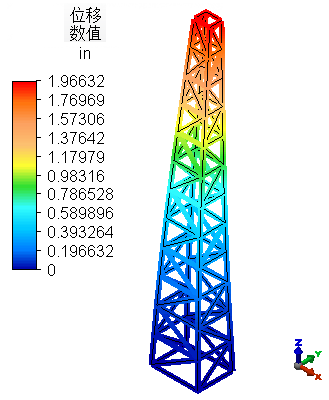 。显示的位移大小是五个固有振动模式位移的结果。最大位移大小约为 1.97 英寸,如下图所示。
