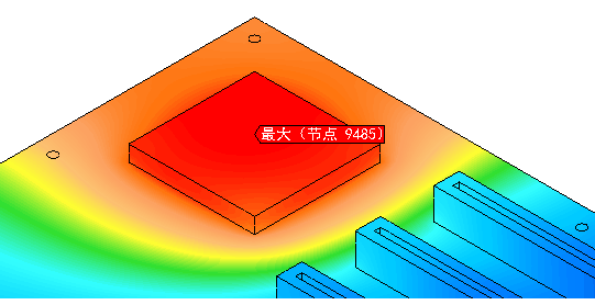“显示内部网格”以启用该选项。仔细观察图例和最大结果探测,同时启用“显示内部网格”选项。当显示内部网格时,节点编号和最高温度都会更改。当“显示内部网格”选项处于激活状态时,请记录在最大探测上显示的节点编号。您的模型应类似于下图。节点编号和位置可能因内部网格的差异而异。