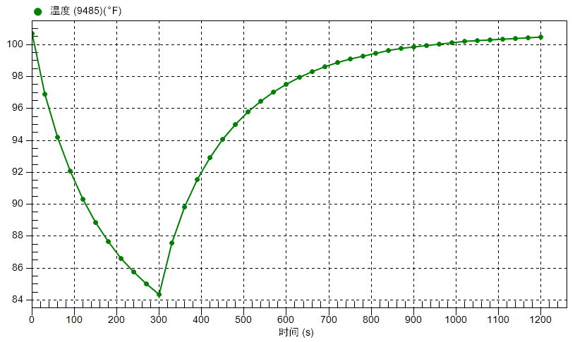选定节点的温度在前 300 秒(冷却期间)大约下降 16°F。300 秒时,温度仍比环境温度大约高 4°。301 秒时,继续以 5 瓦特的速率生成热,而且在仿真事件的剩余时间仍保持此速率。在这个 15 分钟期间内,芯片再次接近稳态温度(小于 0.5°F)。