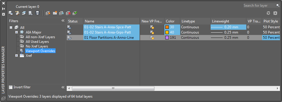 - A predefined filter named Viewport Overrides is displayed in the tree view where all layers with viewport overrides are listed.